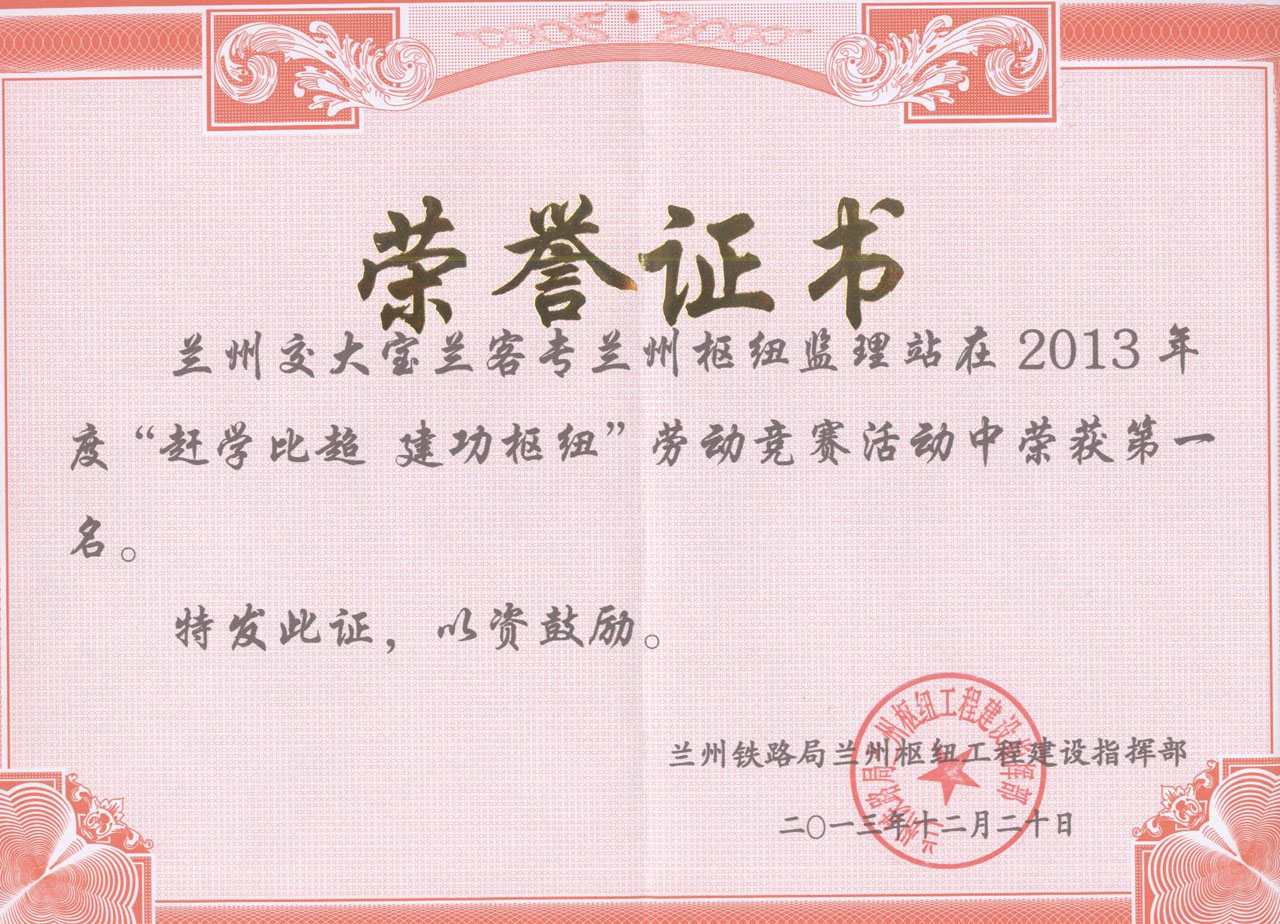 在兰州铁路局兰州枢纽工程建设指挥部组织的“赶学比超、建功枢纽”劳动竞赛活动中,我公司兰州枢纽监理站高度重视,发挥理论与实际相结合的优势,认真制定活动计划,积极组织并贯彻落实。在“赶、学、比、超”活动中,兰州枢纽监理站工作人员在施工现场积极主动工作,主动优化设计并得到设计单位和建设单位的认可,且得到建设单位兰州局范围内传真电报通报表扬。对发现的质量问题及时制定解决办法,进行盯控整改。对每月工程进度进行系统分析并形成书面材料,用以指导工期控制,充分发挥了监理单位的延伸作用,得到兰州枢纽工程建设指挥部的一致肯定,在参与本次劳动竞赛活动的八家监理单位中脱颖而出,荣获2013年度“赶学比超,建功枢纽”劳动竞赛活动第一名,并获得荣誉证书及奖金伍万元的奖励。