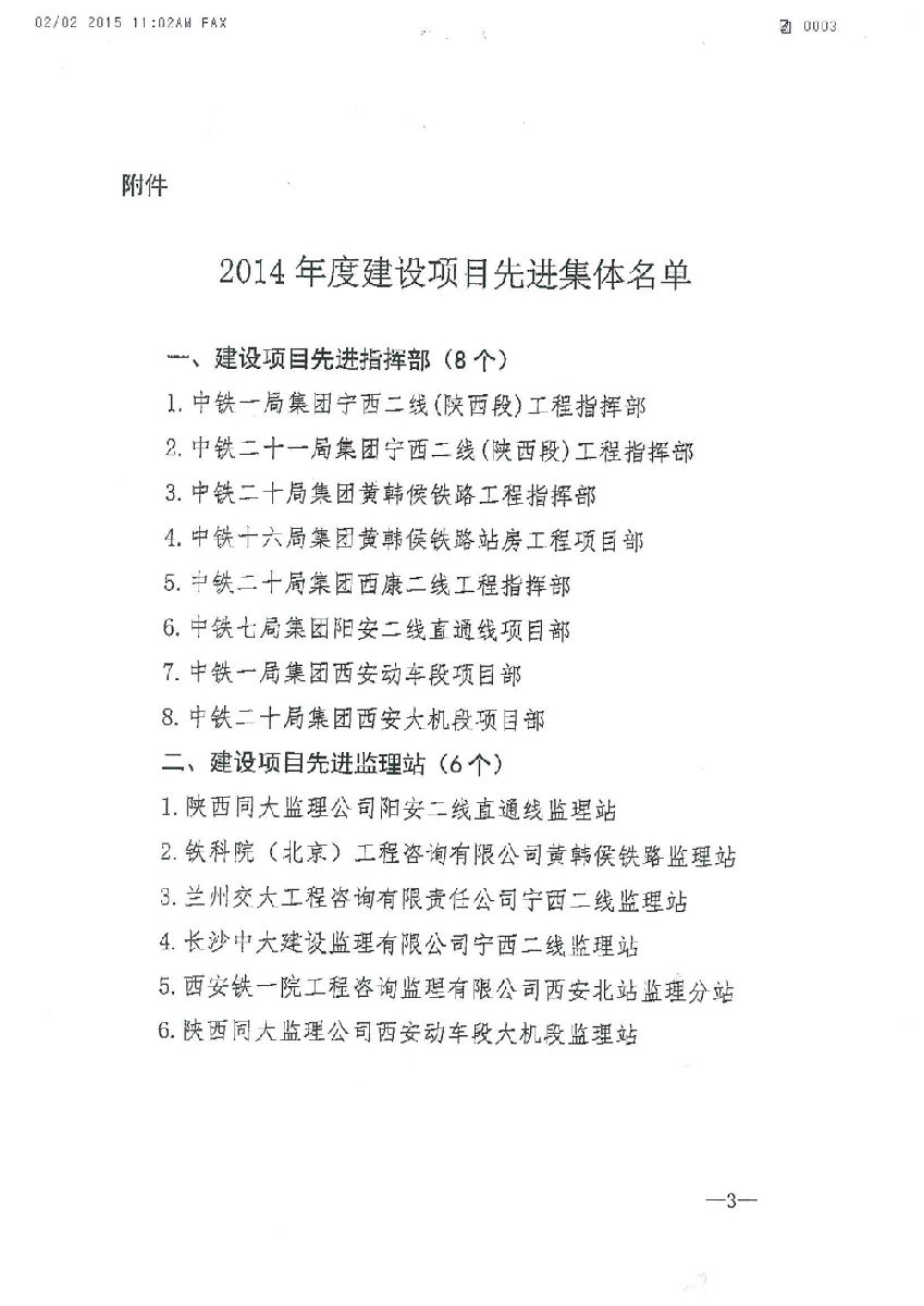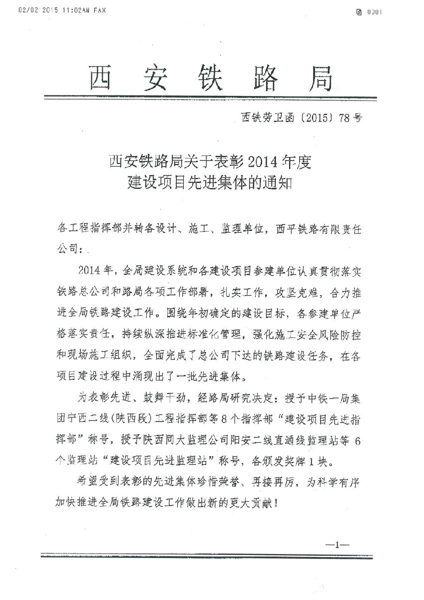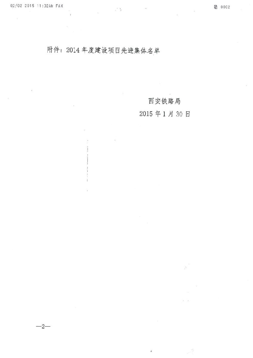 我公司宁西二线监理站荣获西安铁路局2014年度建设项目先进集体表彰