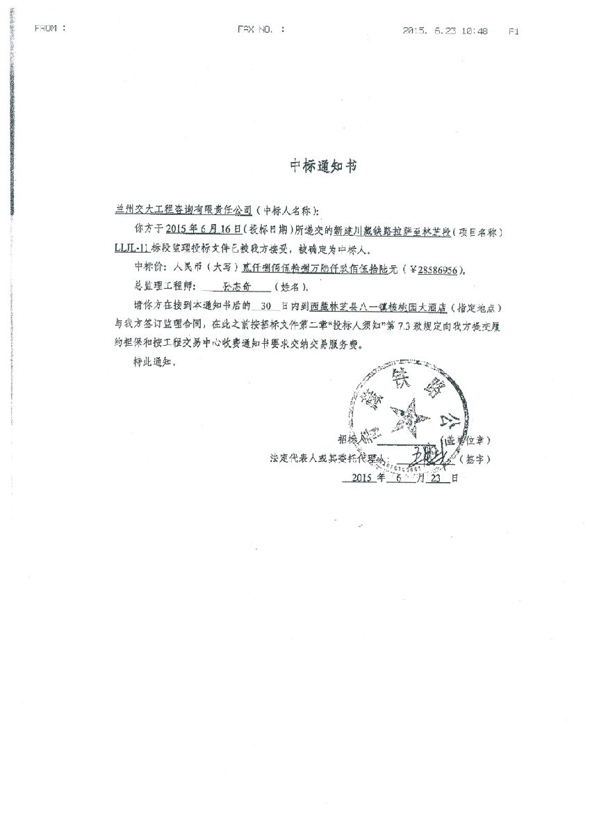 我公司在2015年6月16日开标的“新建川藏铁路拉萨到林芝段”监理项目招标中一举中标。