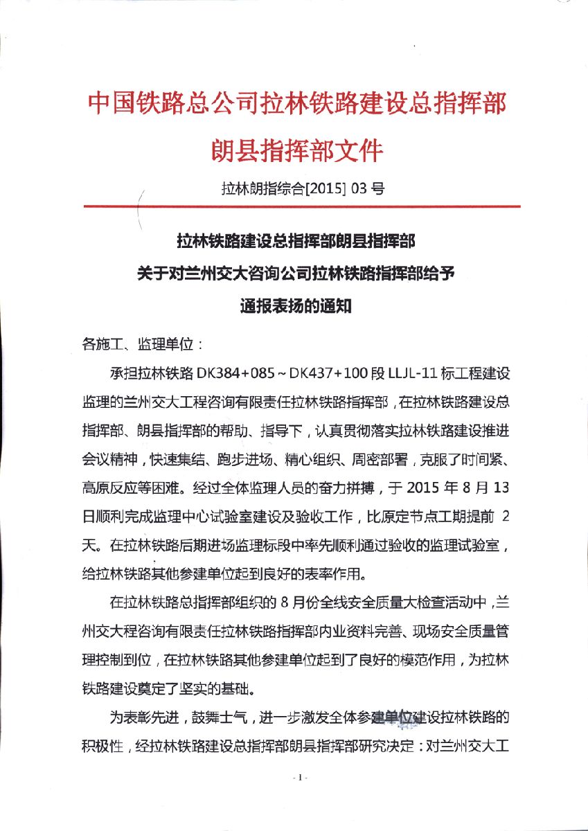 在公司大力支持和拉林铁路建设总指挥部的正确指导下,我公司承担LLJL-11标监理任务的拉林铁路监理站自开工以来,快速集结、跑步进场、精心组织、周密部署、克服了时间紧、任务重、高原反应等困难,在全体监理人员的共同努力下,于2015年8月13日顺利完成中心试验室建设及验收工作。我中心试验室为全线率先顺利通过验收的试验室,给拉林铁路参建单位起到了良好的表率作用。同时,在拉林铁路总指挥部组织的八月份全线安全质量大检查中,我监理站业资料完善,现场安全质量卡控到位,给全线参建单位起到了模范带头作用,为拉林铁路建设监理工作开展奠定了坚实的基础。2015年9月1日拉林铁路建设总指挥部发文给予我站通报表扬。