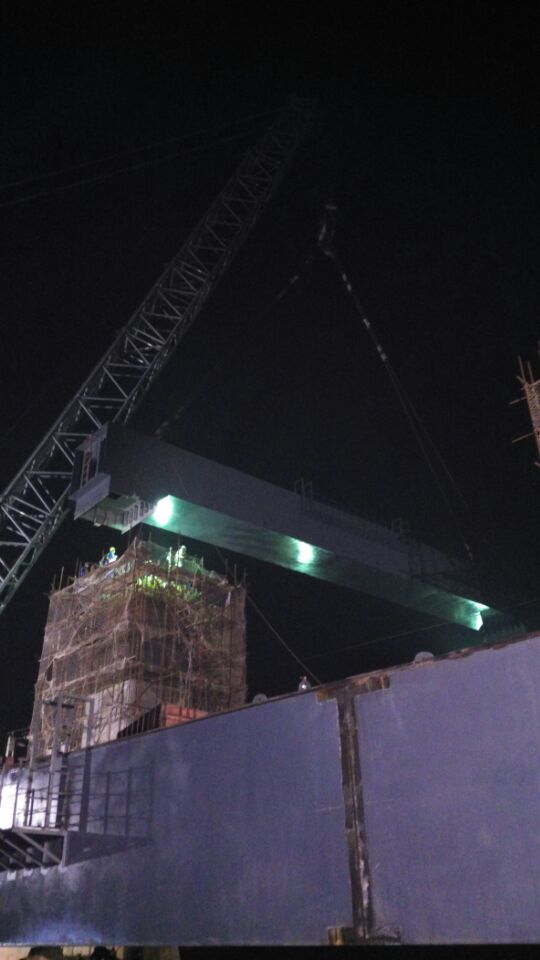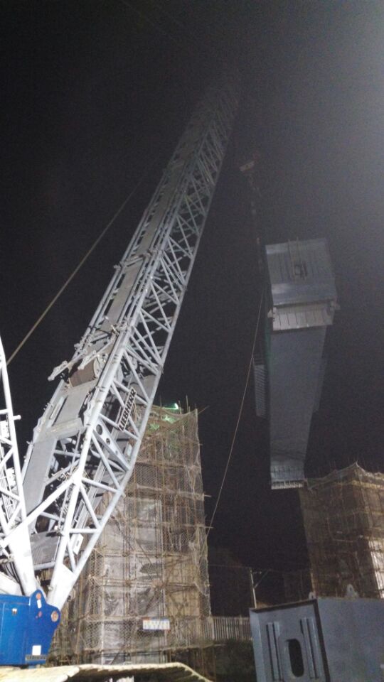 该桥技术含量高,施工难度大。且工期紧、任务重。监理站高度重视该桥施工安全质量,派驻经验丰富监理人员驻场监造,确保出场钢梁各项检验指标满足设计要求。同时成立钢梁吊装现场监理组,全面负责吊装现场的安全质量监控工作。并于12月14日凌晨1:37分顺利完成首榀(21#)钢梁吊装就位工作,比计划吊装日期提前9天完成,得到了武广公司大冶指挥部的通报表扬。