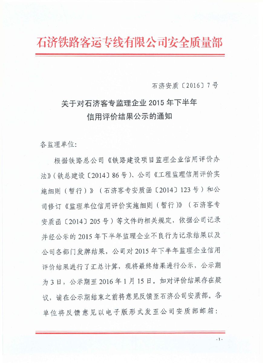 2016年1月11日,石济客专公司安质部下发【2016】7号关于对石济客专监理企业2015年下半年信用评价结果的通知,我公司石济客专监理站以299分的成绩位居第一名。