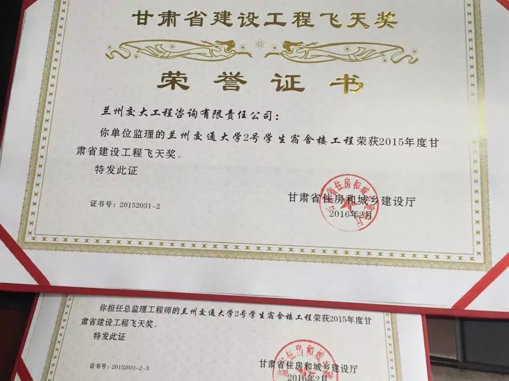 2016年2月5日,甘肃省建设工程2015年度飞天奖名单公布,兰州交大工程咨询有限责任公司兰州监理总站所监理的兰州交通大学2号学生宿舍楼工程项目,喜获甘肃省建设工程“飞天奖“这一殊荣。