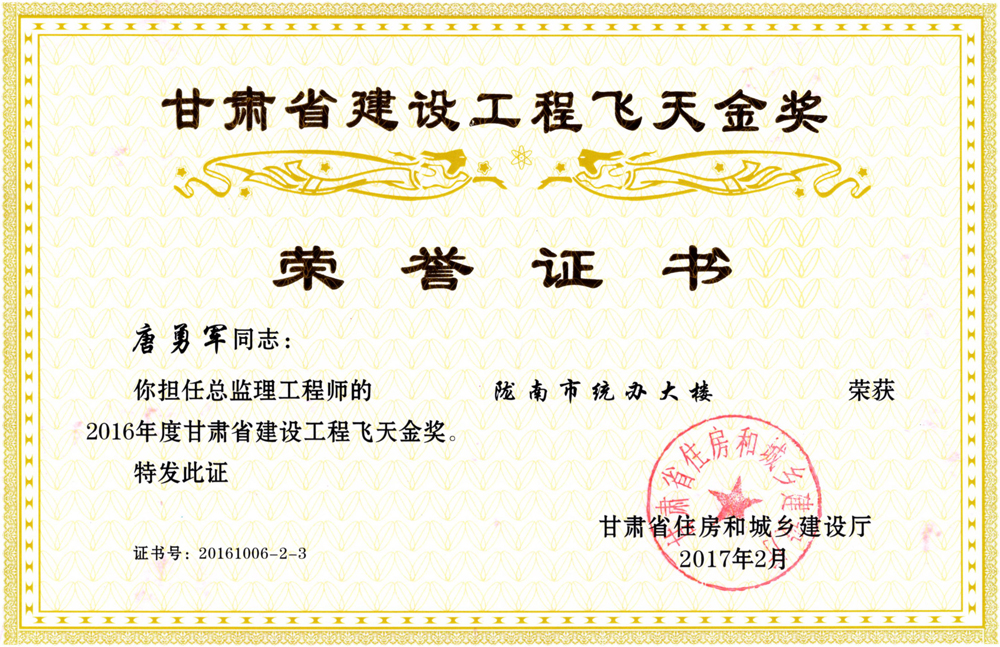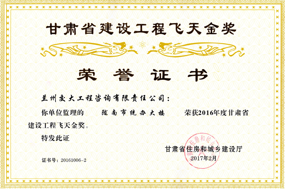 近日,2016年度甘肃省建设工程“飞天金奖”及“飞天奖”榜单揭晓,我公司负责监理的“陇南市统办大楼”项目荣获2016年度甘肃省建设工程“飞天金奖”。甘肃省建设工程“飞天奖”是省政府批准的全省建设工程质量最高奖项,“飞天金奖”更是其最高荣誉。