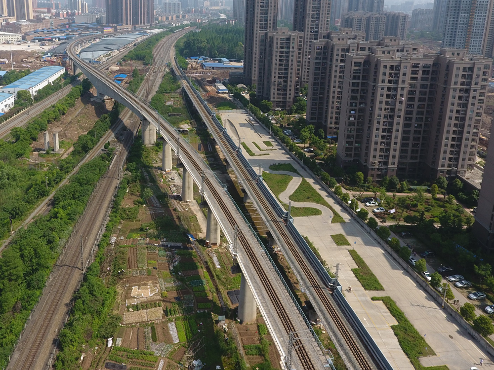 新建武汉至黄石城际铁路是武汉城市圈内一条连接武汉与鄂州、黄石市的快速城际铁路,设计时速120km/h。余家湾上行特大桥位于武汉市余家湾车站附近,距离武昌火车站3.5km,桥梁全长1678.4米(起讫里程:WSDK000+364.265~WSDK002+044.330)。孔跨布置:20-32m简支T梁+2×115mT构+24-32m简支T梁,主跨2×115mT型刚构斜跨京广铁路上下行5股道,夹角28°,为单箱单室直腹板、变高度、变截面箱梁,曲线半径700m。采用平衡转体施工,转体长度231.6m,总重14500t,为亚洲目前最大的T构转体梁。