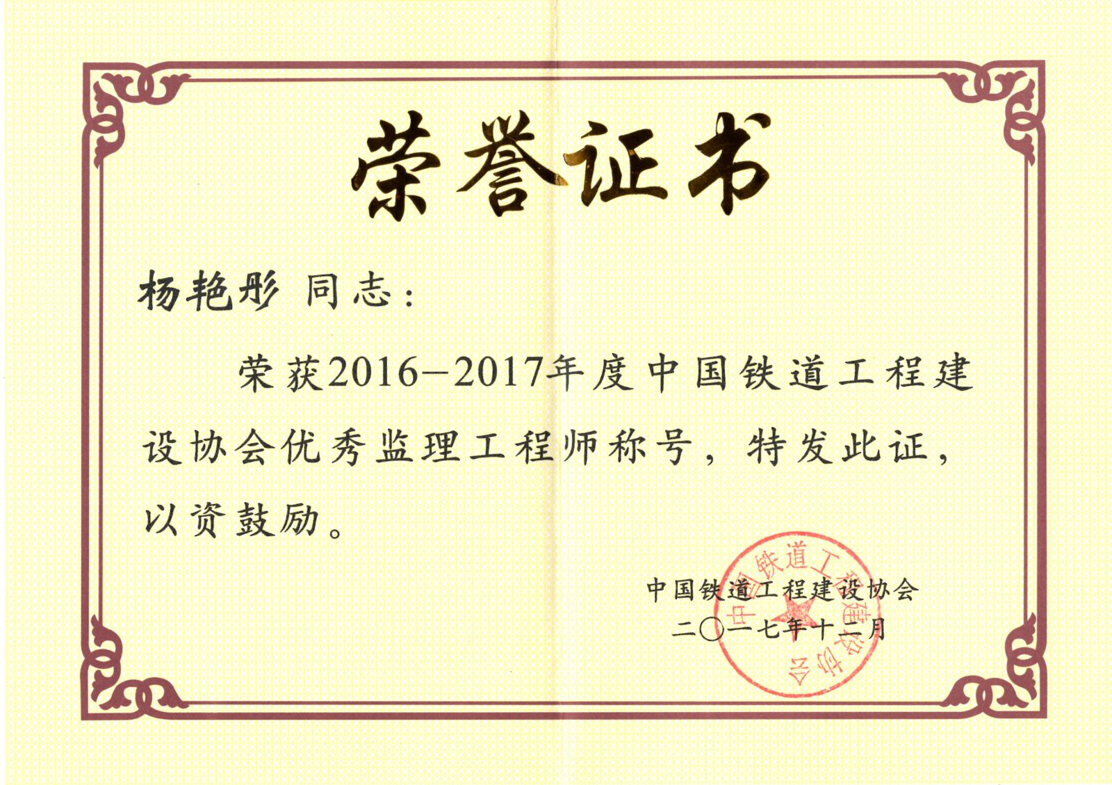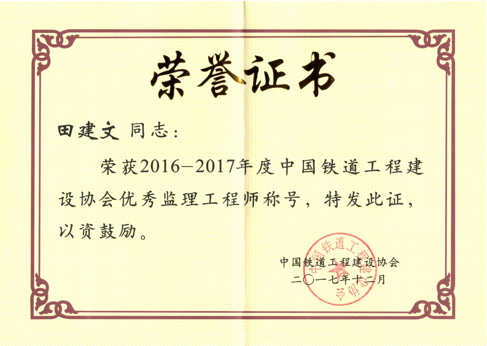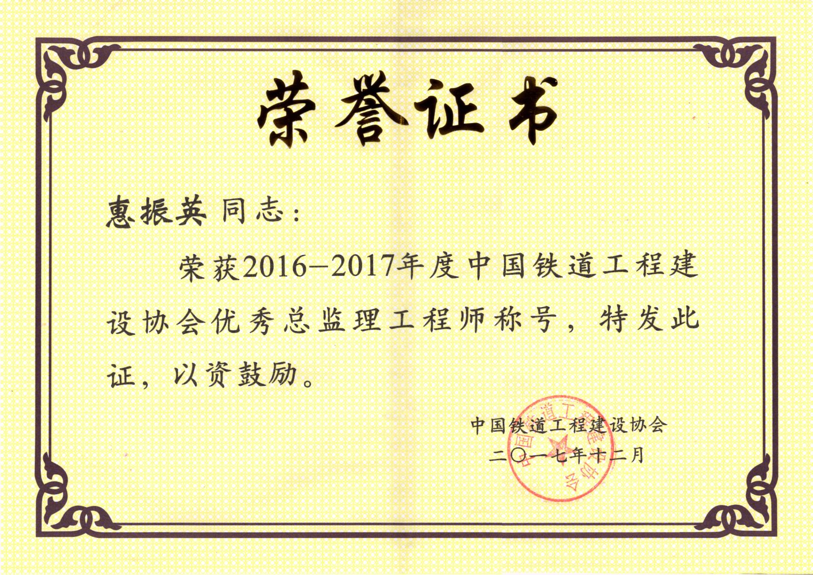 根据中国铁道工程建设协会《关于表彰2016-2017年度先进监理单位和优秀总监理工程师、优秀监理工程师决定的通知》(建协铁[2018]4号)文件,我公司惠振英同志荣获优秀总监理工程师称号,杨艳彤、田建文同志荣获优秀监理工程师称号。