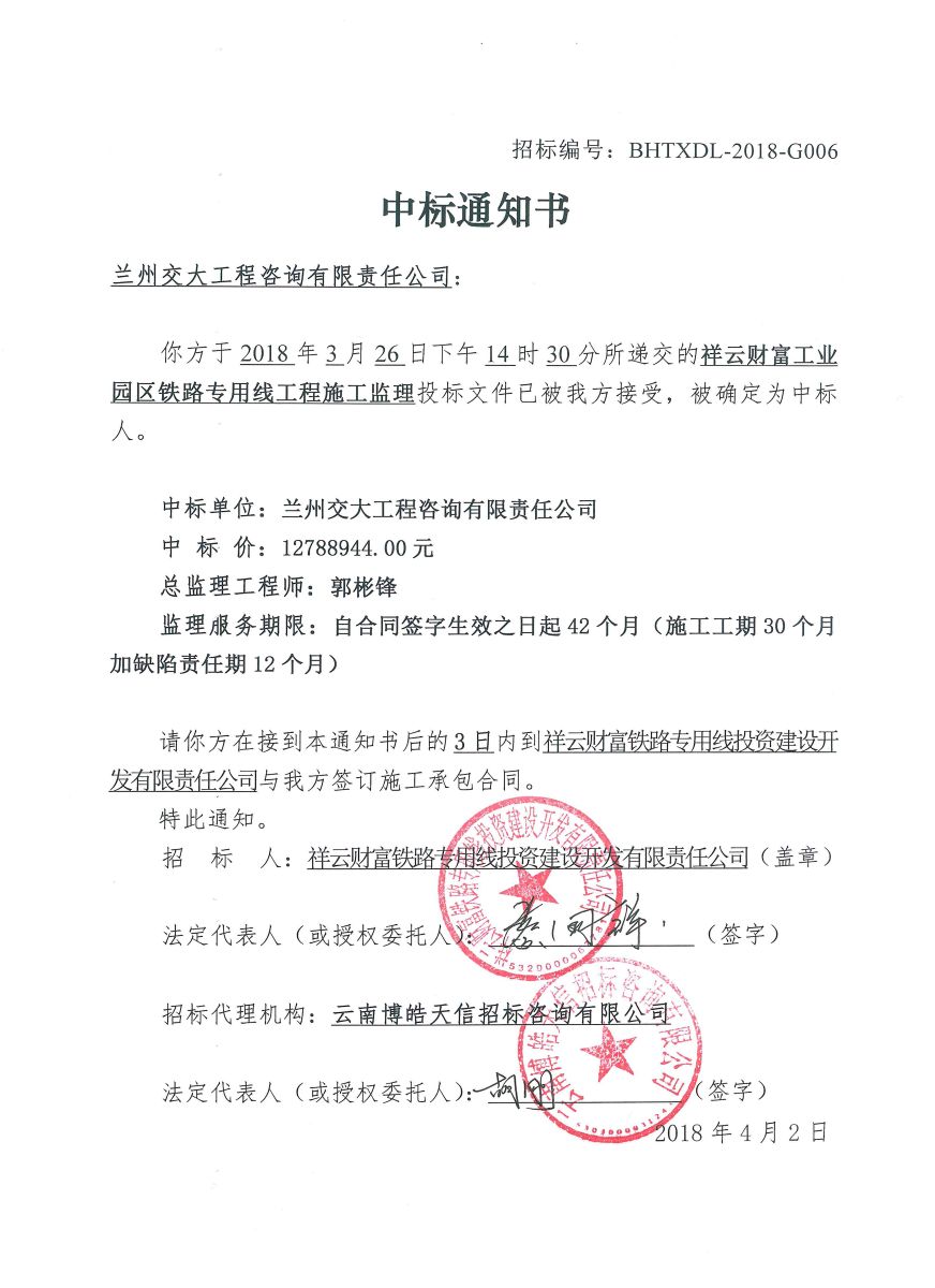 公司于2018年4月2日成功中标祥云财富工业园区铁路专用线项目。工程建设地点:云南省大理州祥云县境内;设计规模:线路从既有祥云站牵出线接出后,沿既有广大铁路左侧至诸葛寨山,之后沿诸葛寨山西侧走行至新农村,上跨既有广大铁路、G56高速公路,以隧道穿越海子山后上跨S220省道,平交产业园区道路后设桥上跨品甸海后进入工业园区。正线长约10公里,新建桥梁7座共计4592.5米,新建单线隧道1座、总延长2651.69米。