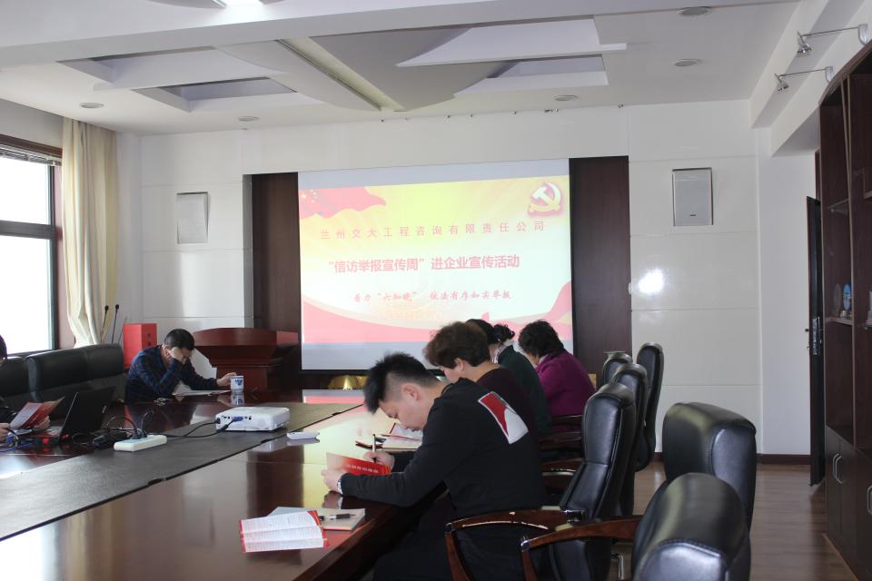 为进一步加大纪检监察信访举报宣传力度,普及信访举报知识,引导广大党员群众依法依规实施监督,2019年3月20日上午,根据甘肃省纪委监委派驻省政府国资委纪检监察组的部署要求,公司党支部在公司会议室组织机关全体职工集中开展了“信访举报宣传周”进企业宣传活动。