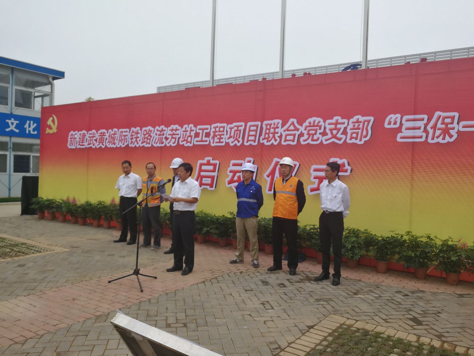 2019年4月26日,武黄城际铁路流芳站改项目联合党支部“三保一创”主题活动启动仪式在流芳站改施工现场举行。各参建单位全体中共党员和各级领导、来宾共150余人佩戴党徽、服装整齐,列队参加了启动仪式。