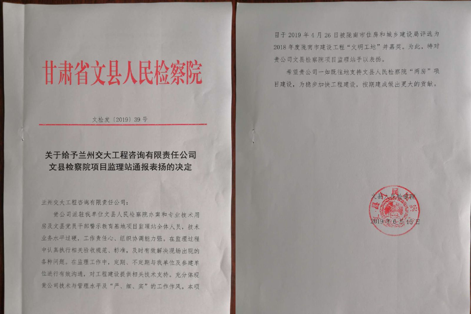 甘肃省文县人民检察院下发《关于给予兰州交大工程咨询有限责任公司文县检察院项目监理站通报表扬的决定》(文检发〔2019〕39号)文件,对文县监理站给予通报表扬。