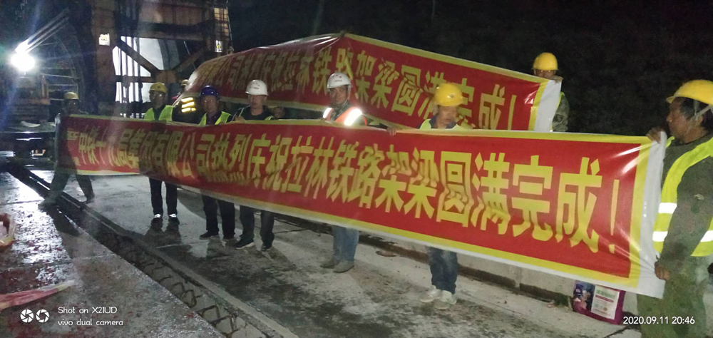 2020年9月11日晚20点30分,寂静湿润的甲格山谷中,突然响起施工人员的欢呼声和噼噼啪啪的鞭炮声,他们是在庆祝拉林铁路甲格车站双线大桥最后一片梁安全架设完成,这标志着我公司拉林铁路指挥部(LLJL-11标)管段的所有桥梁安全顺利架设完毕。