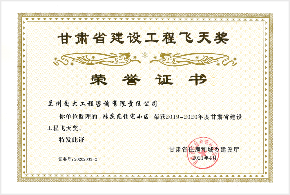 由公司兰州监理总站承担监理的甘肃省消防总队鸿庆苑住宅小区工程荣获“2019-2020年度甘肃省建设工程飞天奖”。