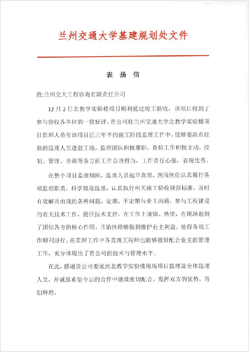 兰州交通大学北教学实验楼项目监理站获业主来信表扬