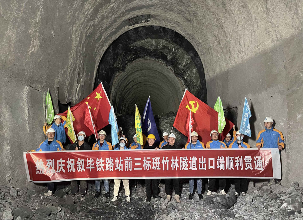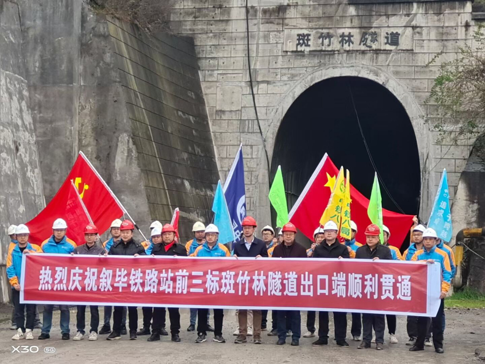 叙毕铁路斑竹林隧道全长12758米(本标段全长3805米),位于云南省昭通市威信县境内,属全线控制性工程,本标段分出口和斜井两个掌子面组织施工。隧道最大埋深270m,最浅埋深36m,隧道穿越可溶岩地层段,岩溶、地下水发育,突水突泥风险大。在叙镇铁路公司的大力支持和帮助下,历经1740个日夜,各参建单位克服地质条件复杂、施工难度大、软岩大变形、工期任务紧等困难,根据超前预报结果和围岩变化情况,不断优化施工组织设计,按照“管超前、短进尺、弱爆破、强支护、快封闭、勤测量”的原则,严格落实各项隧道安全管理制度,在保安全保质量的基础上,实现了斑竹林隧道出口与斜井的安全顺利贯通,为叙毕铁路新一年的建设任务实现开门红,为实现叙毕铁路全线通车的目标又迈进了一大步。