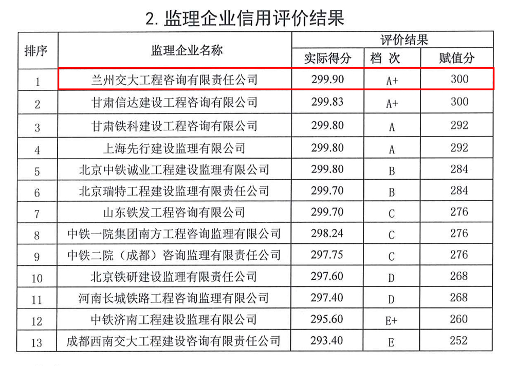 近日,中国铁路兰州局集团公司发布“2021年下半年铁路建设项目监理企业信用评价结果”, 我公司中兰铁路项目参评,并以299.90分A