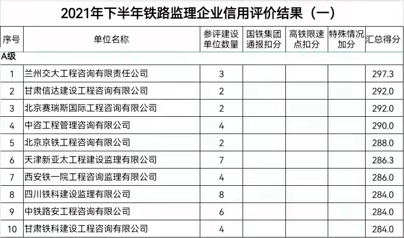 近日,中国国家铁路集团“2021年下半年铁路监理企业信用评价结果