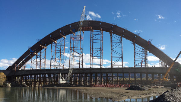 年楚河特大桥主桥为60+148+60米连续箱梁,主跨支座采用V结构,钢管拱拱肋计算跨度134m,中心最高点距桥面36m。拱肋采用变高度哑铃型截面,内填C55膨胀混凝土。