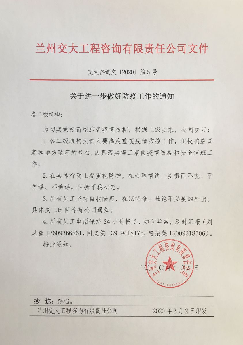 关于印发《兰州交大工程咨询有限责任公司疫情期间复工防控方案》的通知