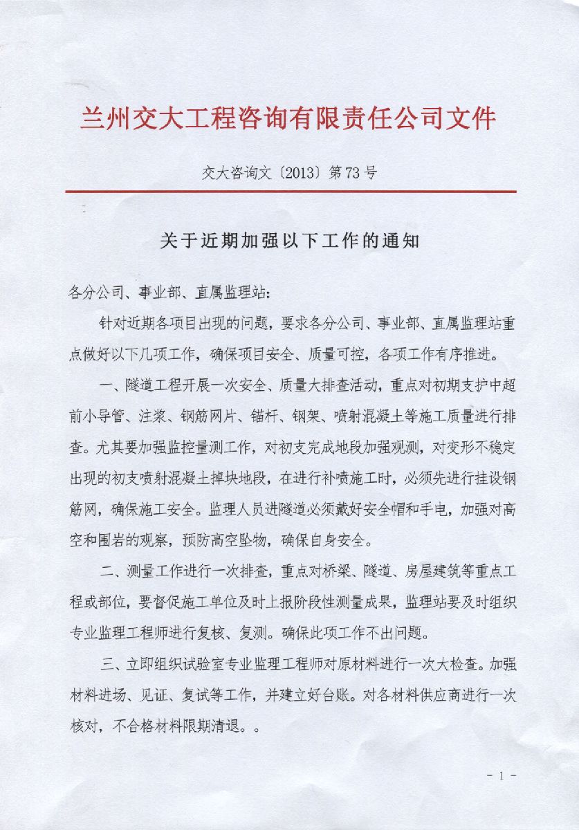 现将《关于近期加强以下工作的通知》(交大咨询文(2013)第73号)转发给你们,望遵照执行。